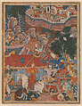 The Hamzanama relates the story of Hamza, an uncle of the prophet Mohammad and an ardent defender of the Muslim faith. In this scene, Assad ibn Kariba, a supporter of Hamza shown dressed in an orange jama, takes an army of unbelievers (non-Muslims) by surprise in a night attack. In the midst of the chaos, the unbelievers attack and kill one another. The drama-filled story of the Hamzanama was a favorite of the Mughal emperor Akbar, who commissioned this magnificent manuscript in 1562. Composed of 1400 illustrations and bound into several volumes, the work took nearly one hundred artists fifteen years to complete.