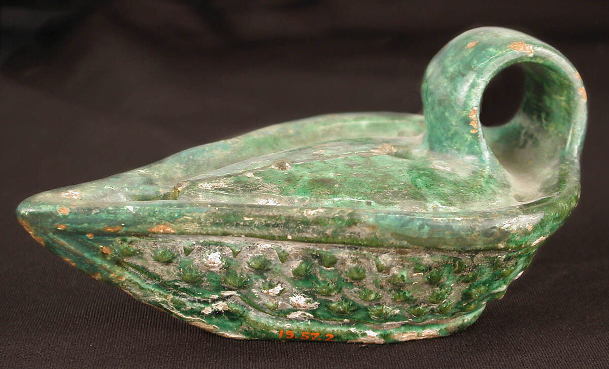 The shallow open lamps previously used in the Middle East were replaced by deeper pinched bowls, imported from Greece in Hellenistic times. However, the low-relief decoration and green or honey-colored glazes are characteristic of the Roman pottery tradition. These lamps burned olive oil through a fiber wick.
