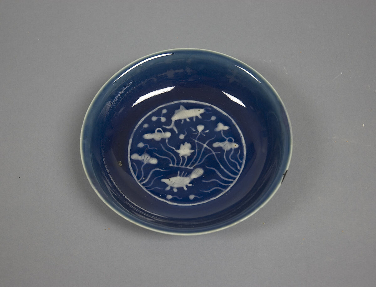 - Medium: Porcelain with white reserve decoration against a blue background