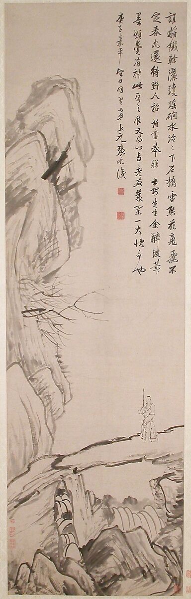 Zhang Feng's father, a military governor, died in 1631 while defending the Ming dynasty against Manchu incursions. After the fall of the Ming in 1644, Zhang withdrew from society and entered the Buddhist church. This painting, one of Zhang's last dated works, epitomizes the bold, free brush manner of his maturity. It shows a lone scholar in a wintry landscape. Clutching a staff with hands drawn into his sleeves to protect them from the cold, he stands erect and motionless beside a stone bridge. The imagery recalls the natural stone arch at Mount Tiantai, a site sacred to Buddhists. Legend has it that anyone who succeeds in crossing the slippery arch will enter paradise and become an immortal. Zhang's autobiographical figure can neither attain paradise nor return whence he came; he is riveted to the harsh reality of the present, where he must face both his limitations and his mortality.