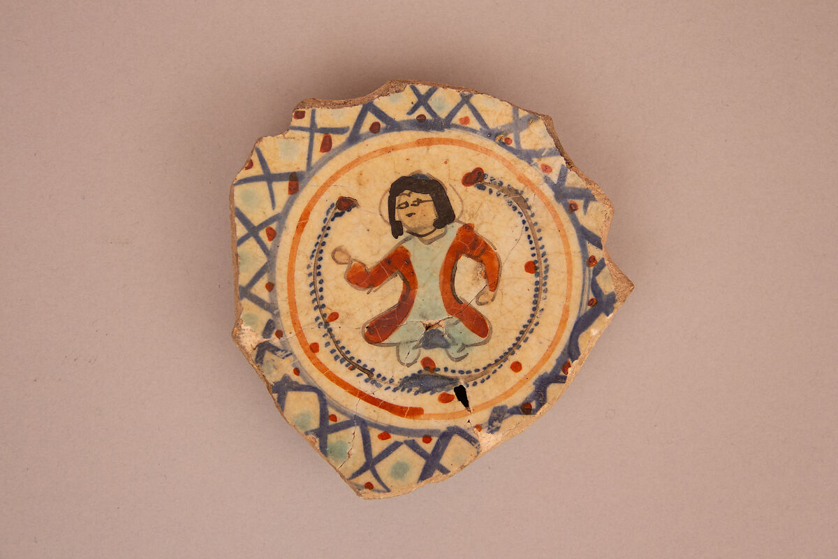This fragment is overglaze-painted with a seated figure surrounded by dotted branches enclosed in a medallion. The painting technique, now called mina’i but historically referred to as haft rang (seven color), was a distinctive Iranian tradition employed on stonepaste, possibly transposed from glass enameling. Mina’i painted wares share some stylistic features with coeval Syrian stonepaste, including the moon-like faces of figures or the dotted branches seen on this piece, that exemplify how a common visual language was adapted to and modified by local techniques, traditions, and tastes.