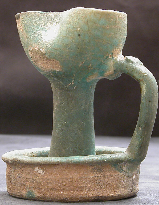 This heavily potted lamp contains an open reservoir that would have held burning oil and a wick. Soaked in the oil and lighted, the wick would transport the fuel to the flame. Similar ceramic lamps were common in Egypt and in Syria in the thirteenth to fourteenth century, together with other examples in which the reservoir is placed on a stem. The undocumented provenance record on this piece states it comes from Syria.