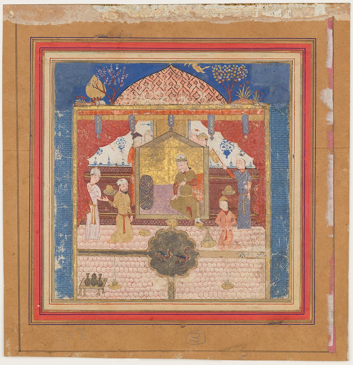 - Title: "Khusrau Parviz before his Father Hurmuzd (?)", Folio from a Shahnama (Book of Kings)