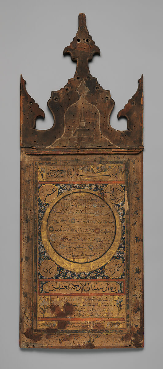 - Medium: Ink, opaque watercolor, and gold on paper; wood