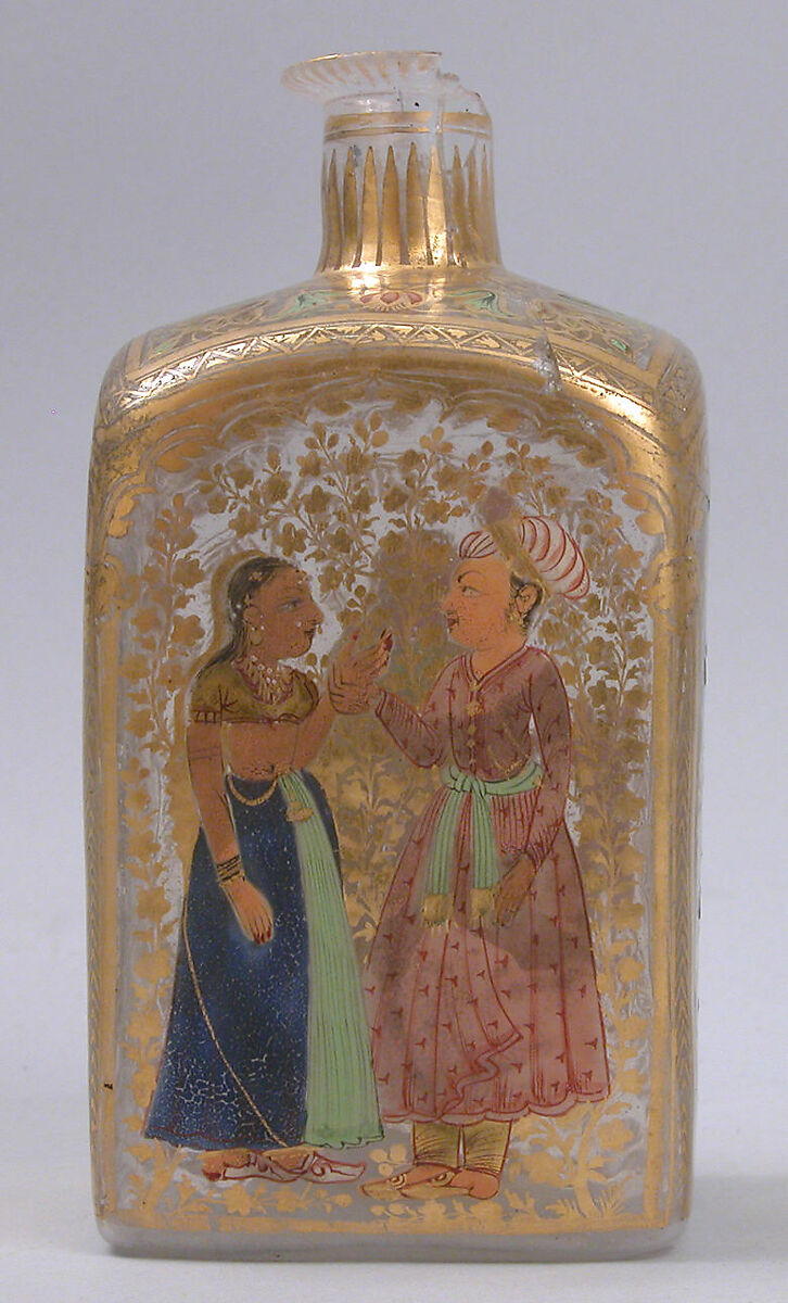 Gilding and enameling were the most popular form of decorating glass in the eighteenth century, and the most common form was a square-shaped bottle, called a "case bottle" because of its similarity to European transport bottles made to fit in wooden cases. In fact, many case bottles were actually made in Europe and later painted in India. They were usually decorated with floral motifs on two sides, and with figural scenes similar in style and subject matter to contemporary paintings on the other two sides.