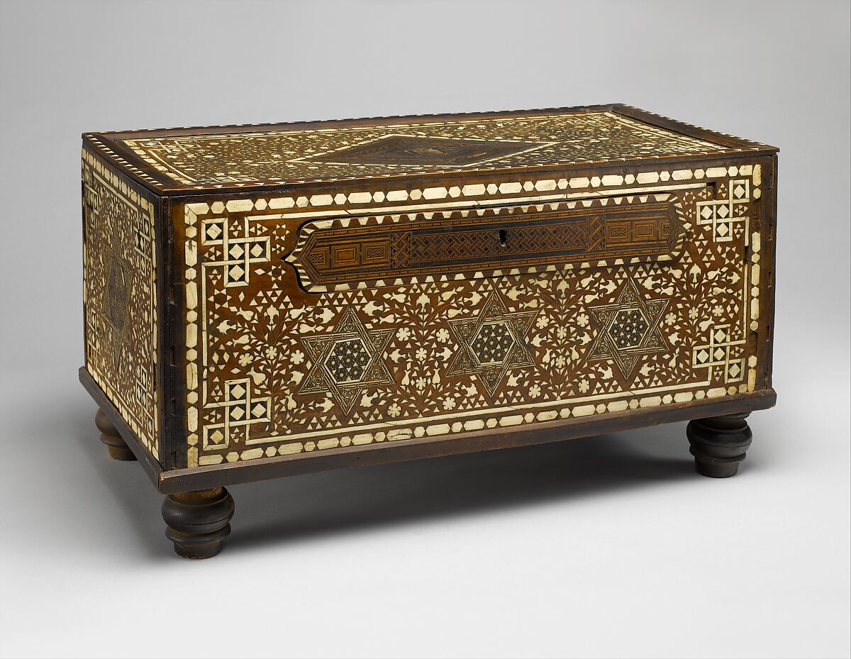 The technique of marquetry and inlaying of wood with contrasting material has always enjoyed great popularity in Egypt, going back to Pharaonic times. Fine examples of Islamic work in the technique date from the ninth century onward. The right-angle linear interlace that surrounds the main panels of decoration, as well as the motifs that fill the elongated cartouche-shaped panel on the front and the lozenge-shaped panel on the top, descend directly—and with little change—from such decoration to be found on ninth-century Egyptian marquetry. The so-called star of David motifs, as well as the patterns of stars and hexagons that fill the larger ones, derive from Roman art, especially floor mosaics, and were especially popular in marquetry and woodwork of the Islamic period. Less distant echoes of decoration in other media are the outside borders of alternating hexagons and elongated hexagons, which ultimately derive from Seljuq architectural ornament and enjoyed popularity as borders for a variety of media, including bookbindings and carpets. Despite the profusion of old motifs present on this box, the background, with its flowering sprays, particularly the tulip blossoms, gives a sure indication of its Ottoman date.
