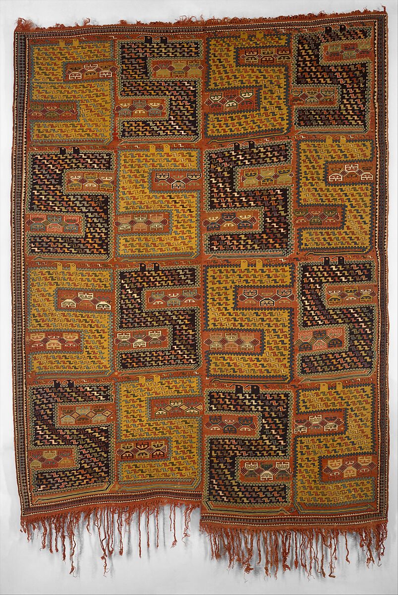 - Medium:Wool (warp, weft and pile), supplementary weft brocaded (soumak)