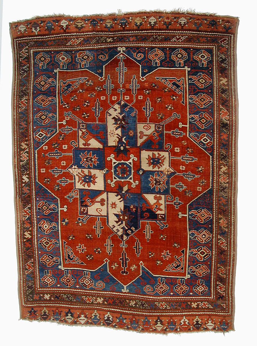 The red ground of this carpet, with its eight-pointed shape, recalls earlier medallion carpets from Anatolia. The central motif, divided into alternating blue and white sectors, however, is reminiscent of nomadic gul or tribal emblems, and strongly suggests the Turkmen heritage of the carpet’s Anatolian village weaver.