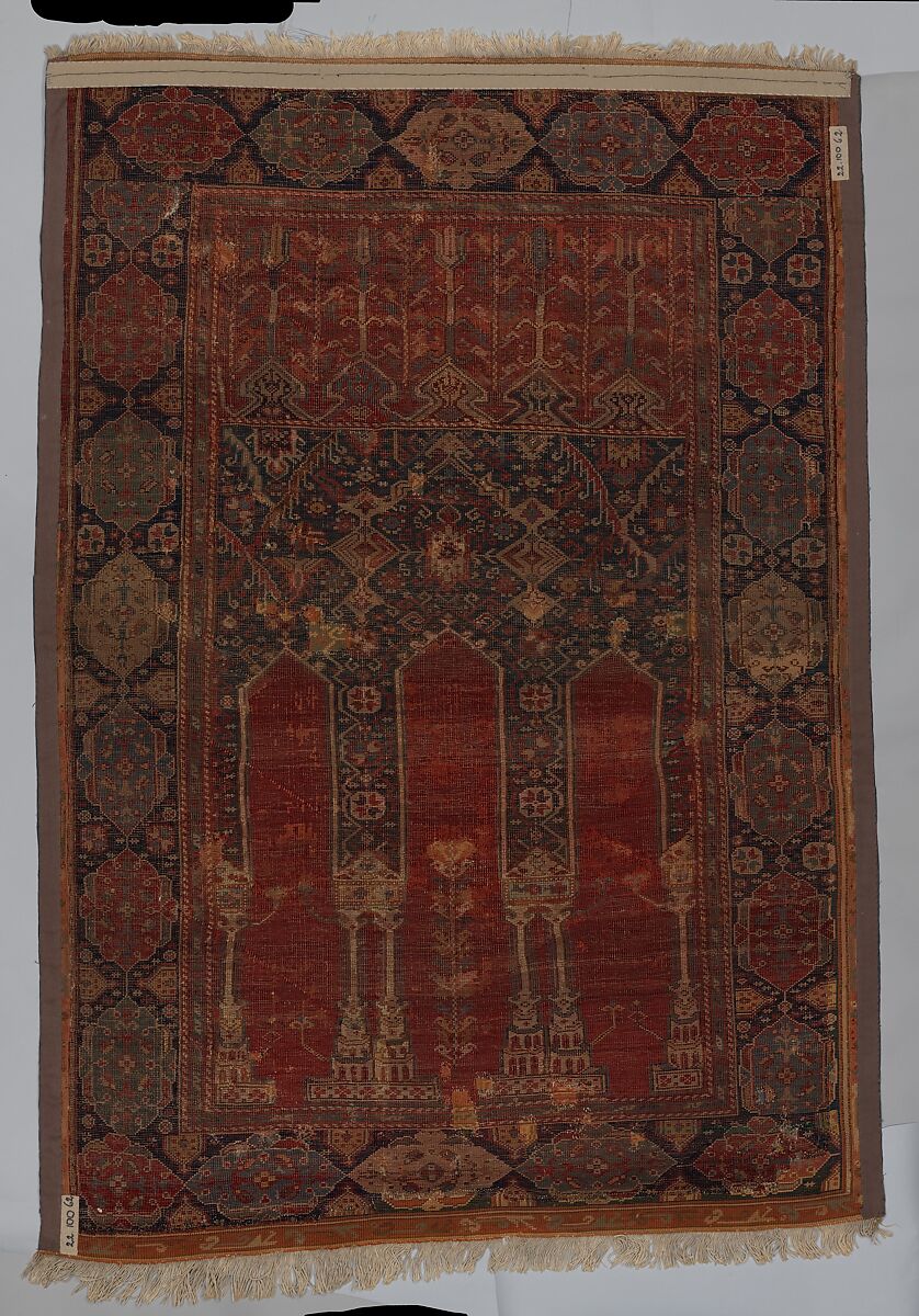 The rich polychrome palette, dominated by deep red and including purple, shades of blue, green, yellow, white, and dark brown, is typical for carpets woven in Ladik during the later Ottoman period. However, the triple arch supported by sets of slim double columns and the tulips above and inside the medallions of the border both recall a famous sixteenth-century Ottoman court prayer rug (the Ballard double-column prayer rug also in The Met collection). The architectural feature is not common in Ottoman buildings. Recent scholarship suggests that the coupled-columns design on Anatolian prayer rugs may have originated in Nasrid Spain and traveled east to Cairo and Istanbul with the emigration of Sephardic Jews beginning in the late fifteenth century; they used a similar motif on parokhets (curtains that cover Torah arks in synagogues).