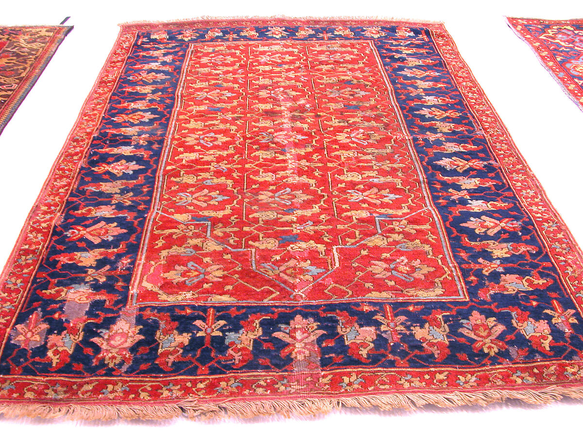 The palette and design of this carpet recalls the famous "Lotto" carpets, named after a well-known altarpiece by Italian Renaissance painter Lorenzo Lotto, that depicts a piece with a striking field pattern of geometrically stylized vegetal arabesques in yellow on a red ground. While the earliest examples of carpets using this design probably date from before 1500, the design remained popular for several centuries, and large numbers were exported to Europe they frequently appeared in paintings. The pattern of this carpet is designed around the motif of a stylized peony blossom repeated in a linear movement in both the field and the border. While the floral style of this Lotto carpet points to a seventeenth century dating, the fine lines dividing the center field in three parts and converging at one end to form a triangle, recall the niche design of Anatolian prayer rugs, in which the mihrab or prayer-niche remained a popular motif.
