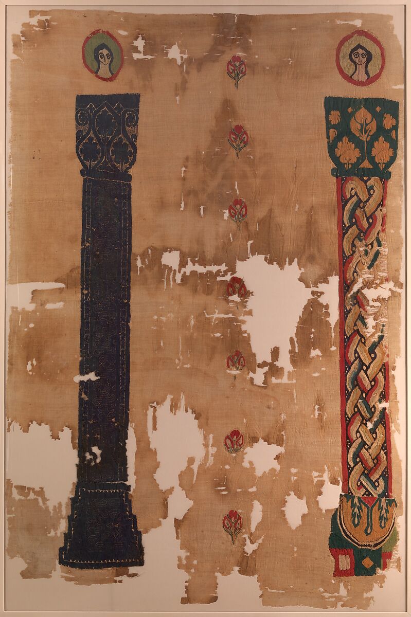 This grand hanging is part of a set of at least four that also included depictions of colorful columns topped by heads in medallions. The pieces were excavated from a grave where they had been used as shrouds, but several features indicate that they were originally employed as curtains. Their large scale precludes the function of clothing and the thinness of their material suggests they were meant to be seen from both sides. Depictions of architecture on contemporary mosaics often show curtains hanging between columns, suggesting that pieces such as this may have been hung one after another in an arcade.