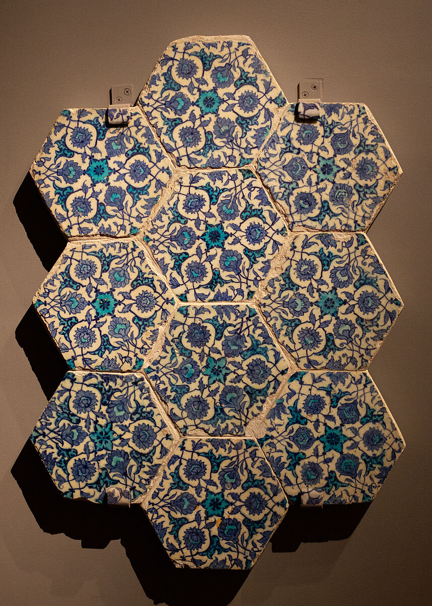 This panel is composed of seven hexagonal tiles. A floral design has been painted in cobalt and turquoise blue on a white ground. Each tile has a six-pointed floral medallion at its center, from which a network of small saz leaves, lotus blossoms, and split-palmette (rumi) leaves emanates. Hence, an endlessly repeating pattern is created, which flows from one tile to the next.
