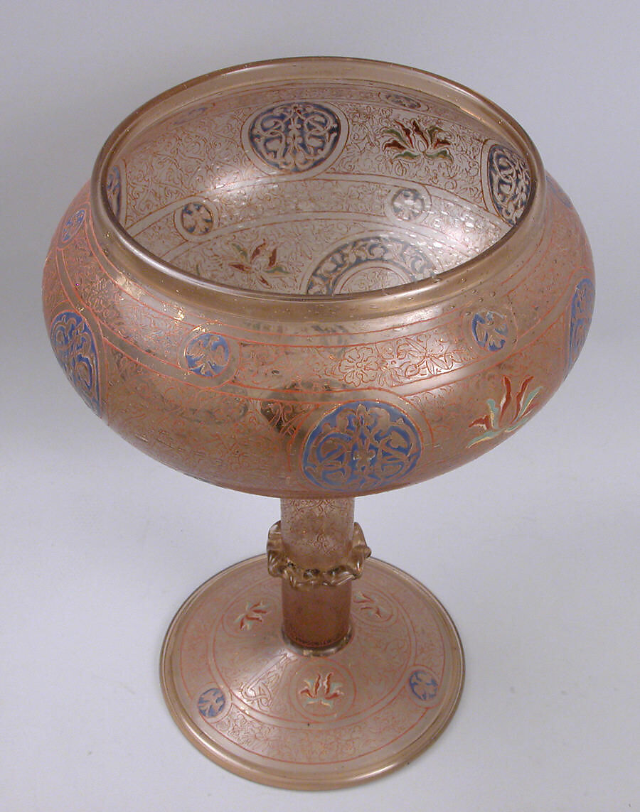 This standing cup or 'tazza' is composed of three pieces: foot, stem, and bowl. The Arabic word The Learned is repeated three times on the foot. This large vessel probably functioned as a container for fruit or sweetmeats and would originally have been surmounted by a knobbed lid.
