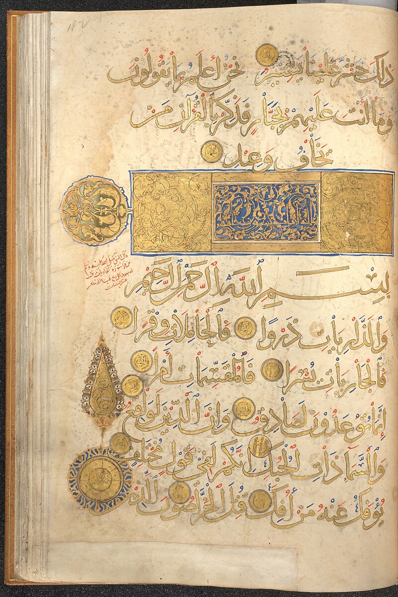 This manuscript is from the second volume of a luxurious Qur’an in which all 274 folios are elaborately illuminated. The text is written in a variation of thuluth script, with gold ink outlined in black and complemented by gold, red, and blue diacritical marks. Illuminated disks indicate verse endings and other denominations. In one of the folios a six-pointed star marks when the worshipper should perform a prostration. It reads sajda, or "prostration".