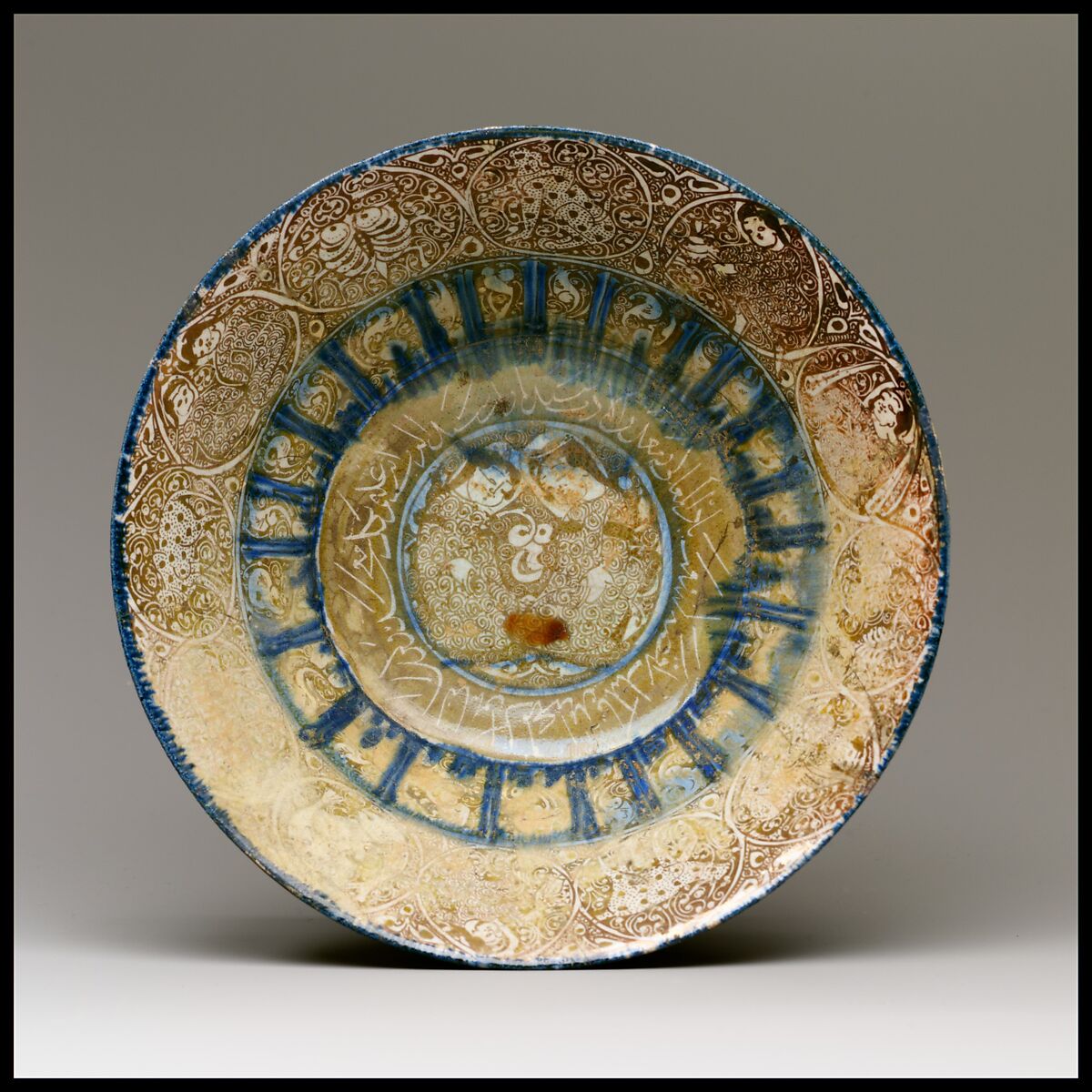 This bowl combines the most distinctive features of lusterware produced in Kashan: moon-faced figures; poetry in naskhi calligraphy; and a covering of spiral marks that fill the areas between the decorative motifs. In addition, the outermost decorative band includes medallions with all twelve signs of the Zodiac. Capricorn (al-jady, "the kid"), is depicted as a small goat in profile. Like the other Zodiac signs that are represented as animals, such as Aries and Taurus, when shown with its Planetary Lord, the personification of the planet, in this case Saturn, sits astride Capricorn.