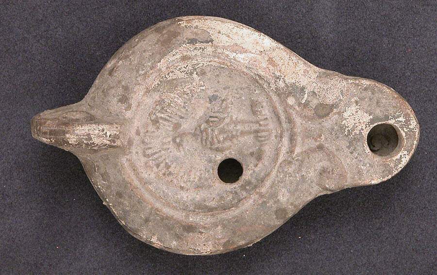 Small earthenware lamps, made from double molds, provided light for Egyptians during the Roman period. A wick produced from plant fiber or linen fabric was placed in a reservoir filled with oil, generally castor or sesame oil, and illuminated. This lamp, which was once painted grey, depicts a peacock in his pride.