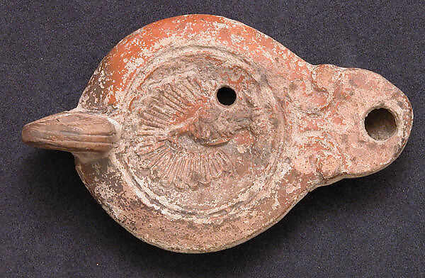 Small earthenware lamps, made from double molds, were the most commonly used source of light for Egyptians during the Roman period. A wick produced from plant fiber or linen fabric was placed in a reservoir filled with oil, generally castor or sesame oil, and illuminated. This lamp is decorated with the image of a peacock displayed and is marked CLO HEL for its maker.