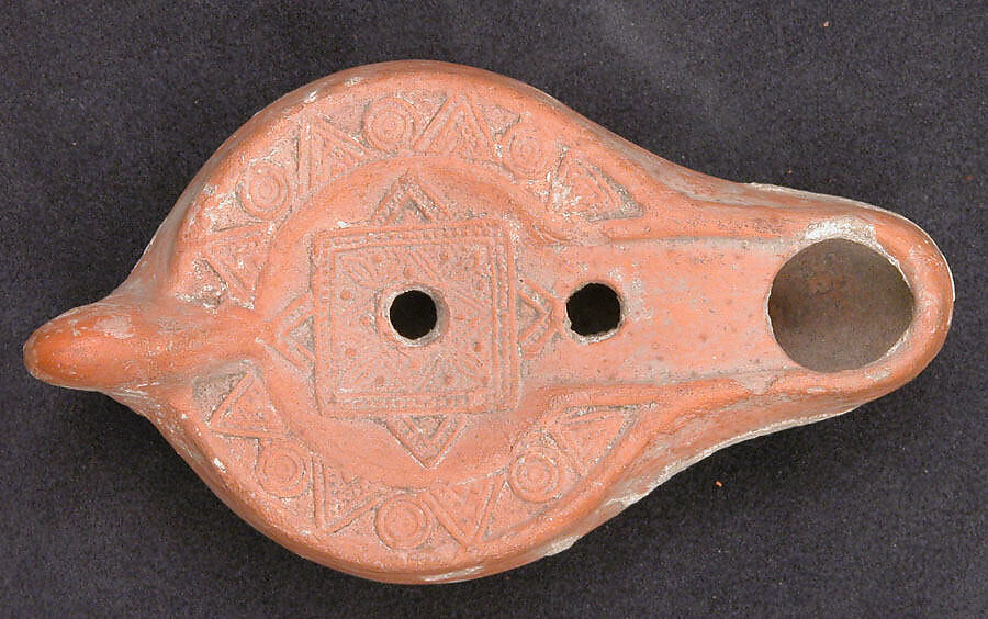 Small earthenware lamps, made from double molds, were the most commonly used source of light in daily Coptic life. A wick produced from plant fiber or linen fabric was placed in a reservoir filled with oil, generally castor or sesame oil, and illuminated. This red earthenware lamp is decorated with superimposed decorated squares, surrounded by a rim decorated with concentric circles alternating with chevrons.