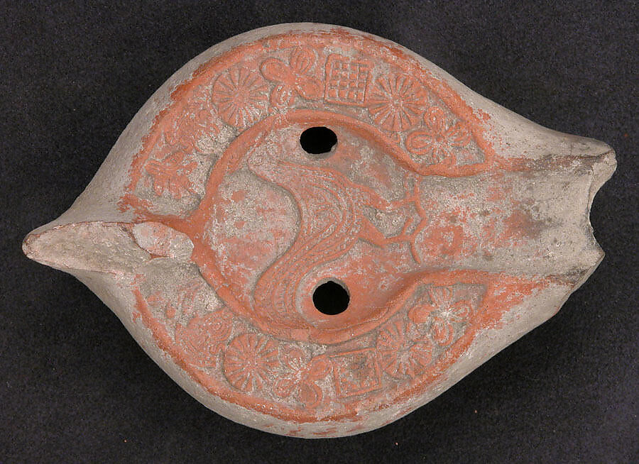 Small earthenware lamps, made from double molds, were the most commonly used source of light in daily Coptic life. A wick produced from plant fiber or linen fabric was placed in a reservoir filled with oil, generally castor or sesame oil, and illuminated. This red earthenware lamp displays the image of a cock, enclosed by a border of leaves, vases, rosettes, quatrefoils, and cross-hatched squares.