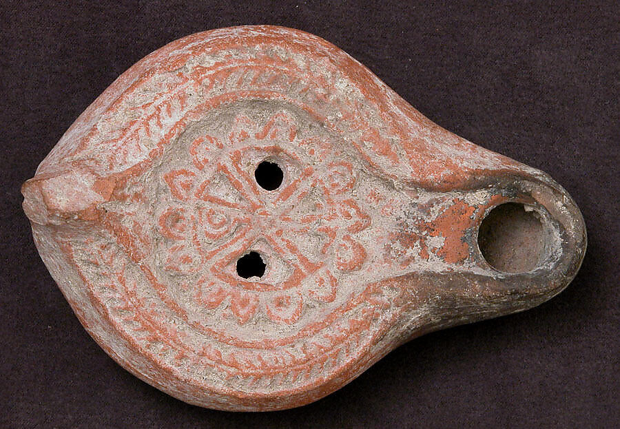 Small earthenware lamps, made from double molds, were the most commonly used source of light in daily Coptic life. A wick produced from plant fiber or linen fabric was placed in a reservoir filled with oil, generally castor or sesame oil. The disc of this lamp is decorated with a reversed chi-rho monogram, consisting of the superimposed capital Greek letters chi (X) and rho (P), which are the first two letters of Christ in Greek. Christian symbols such as this monogram were thought to offer protection for the lamp’s owner.