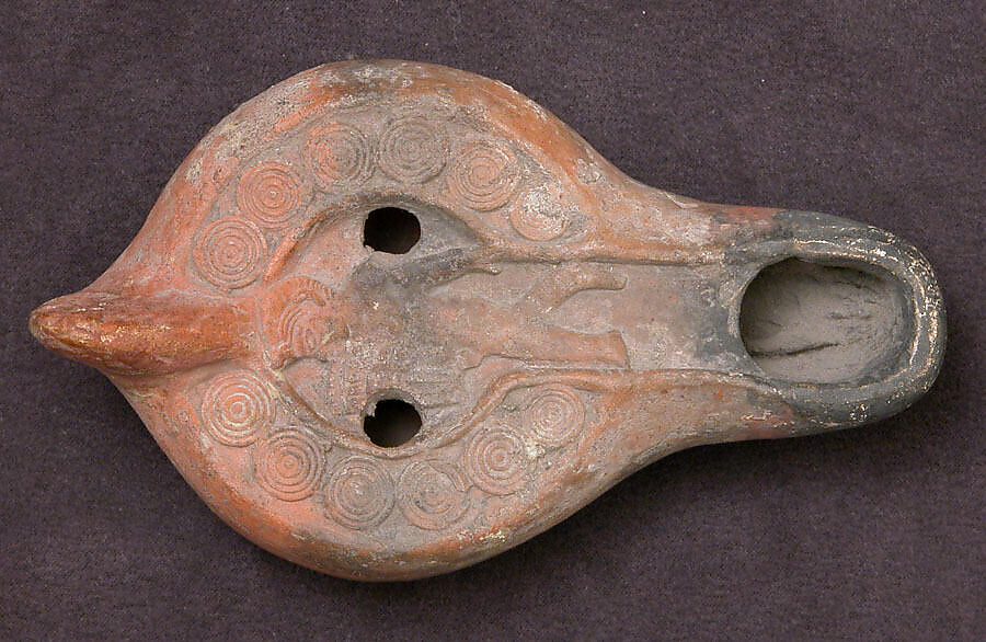 Small earthenware lamps, made from double molds, were the most commonly used source of illumination in daily Coptic life. A wick produced from plant fiber or linen fabric was placed in a reservoir filled with oil, generally castor or sesame oil. The disc of this red earthenware lamp is decorated with Pan playing pipes and is surrounded by a border of concentric circles.