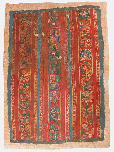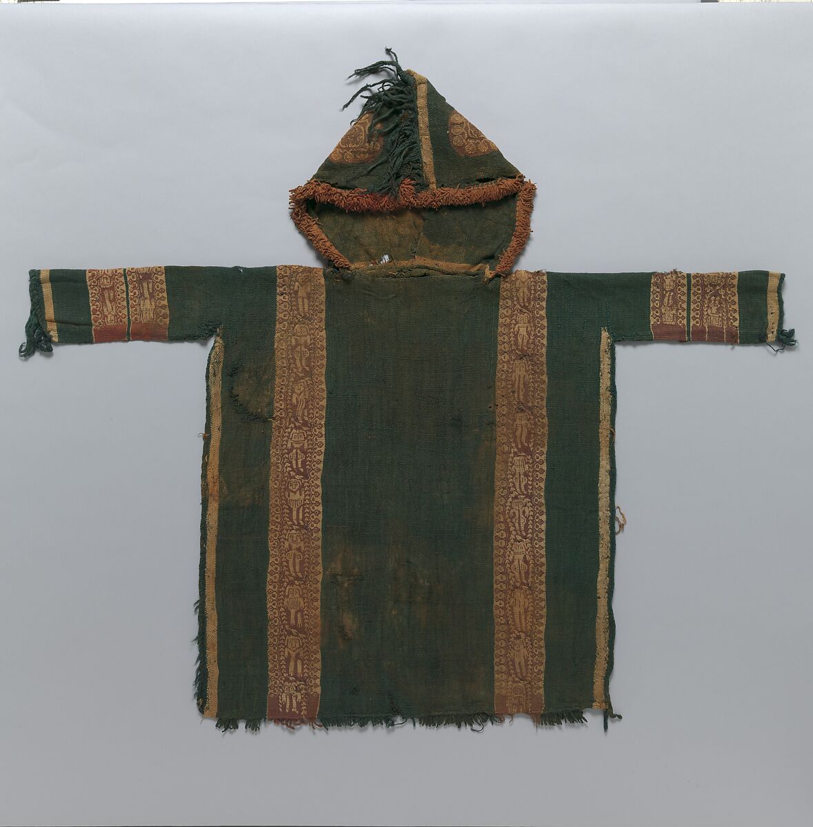 - Medium: Tapestry weave in purple-colored, red-brown, and undyed wool on plain-weave ground of green wool; fringes in green and red-brown along the perimeter of the hood and lower edges