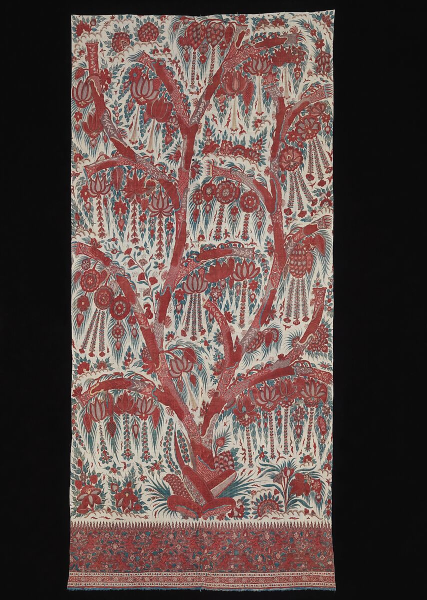 This type of dyed cloth, known as a palampore (from palangposh, the Hindi term for bedcover), was made in abundance in India for foreign markets in the late seventeenth and eighteenth centuries, and their decoration, often with a central tree laden with fruits and birds, combined patterns from English embroideries, Chinese decorative objects, and Indian textiles. In Europe, they were used as bedcovers and were also hung on the walls of bedrooms. In Southeast Asia, where this piece might have been traded, such textiles were displayed during religious ceremonies.