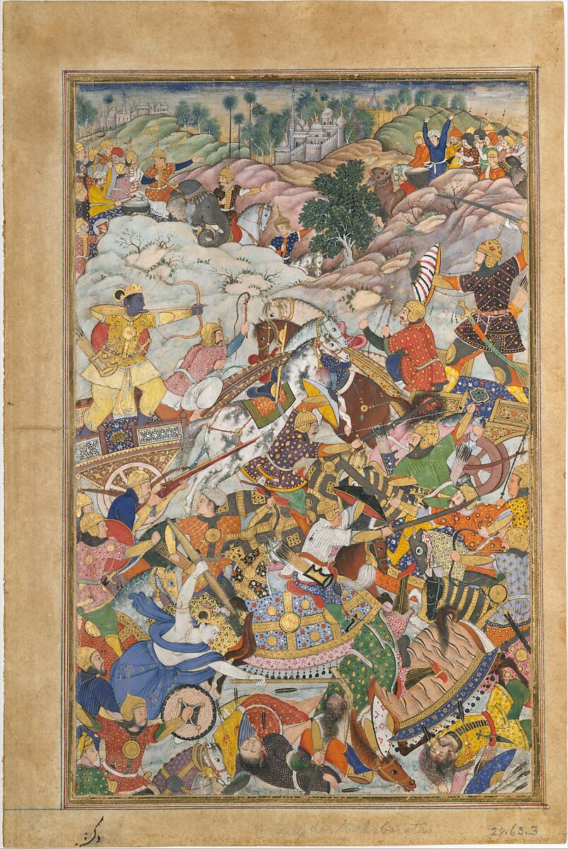 A flurry of warriors clash in this epic scene from the Persian translation of the Hindu classic, the Harivamsa. Krishna, on the left, stands in a chariot and is about to release an arrow. His arrow is intended for a soldier in black and gold armour who stands in a chariot, wielding a shield and sword. Krishna is dressed in yellow garments, a body shield, and sports a crown. Below him, and closer to the left corner, is Balarama, who is fighting using his plow and pestle. He is dressed in blue, and wears a crown. The combat scene is a melee of clashing swords, flying banners, and strewn bodies. The dynamic action of the battle scene is typical of the Akbar period, while the style of the rocks still shows dependence on Persian painting.