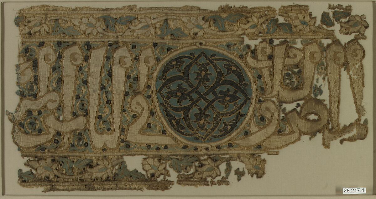 This fragment of a Mamluk textile is woven in an exceptionally fine tapestry weave. The tall horizontal border contains a fragmentary thuluth inscription in white and outlined in beige, interrupted by a roundel decorated by an arabesque design in black, outlined in beige on a blue ground. The inscription’s background blue colour is further decorated with scrolls and black dots. Above and below the central band are bands of peony scrolls. The style of the decoration recalls Mamluk metalwork which often follows a similar layout. The surviving inscription, “…and peace among men…” relates to the birth of the Prophet but does not provide information about the maker or patron. This fragment may originally have been part of a robe of honour, which was often presented to officials in the court as a sign of favour from the caliph.