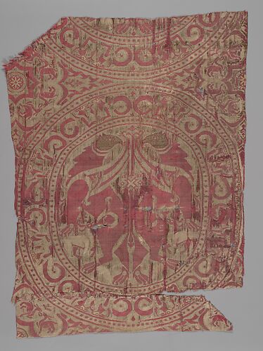 This textile exhibits bands of varying patterns, some including interlacing calligraphic inscriptions. Here, the texts convey wishes for happiness, good fortune and prosperity. The hues of this brightly-colored fragment - with its contrasting red, green and gold - characterize the textiles produced during the Nasrid and later periods in Spain and North Africa. Its appearance is in sharp contrast to textiles produced in earlier periods. The earlier pieces exhibit a lighter, more delicate palette of minty greens, light blues and a heavy use of golden metal-wrapped threads.