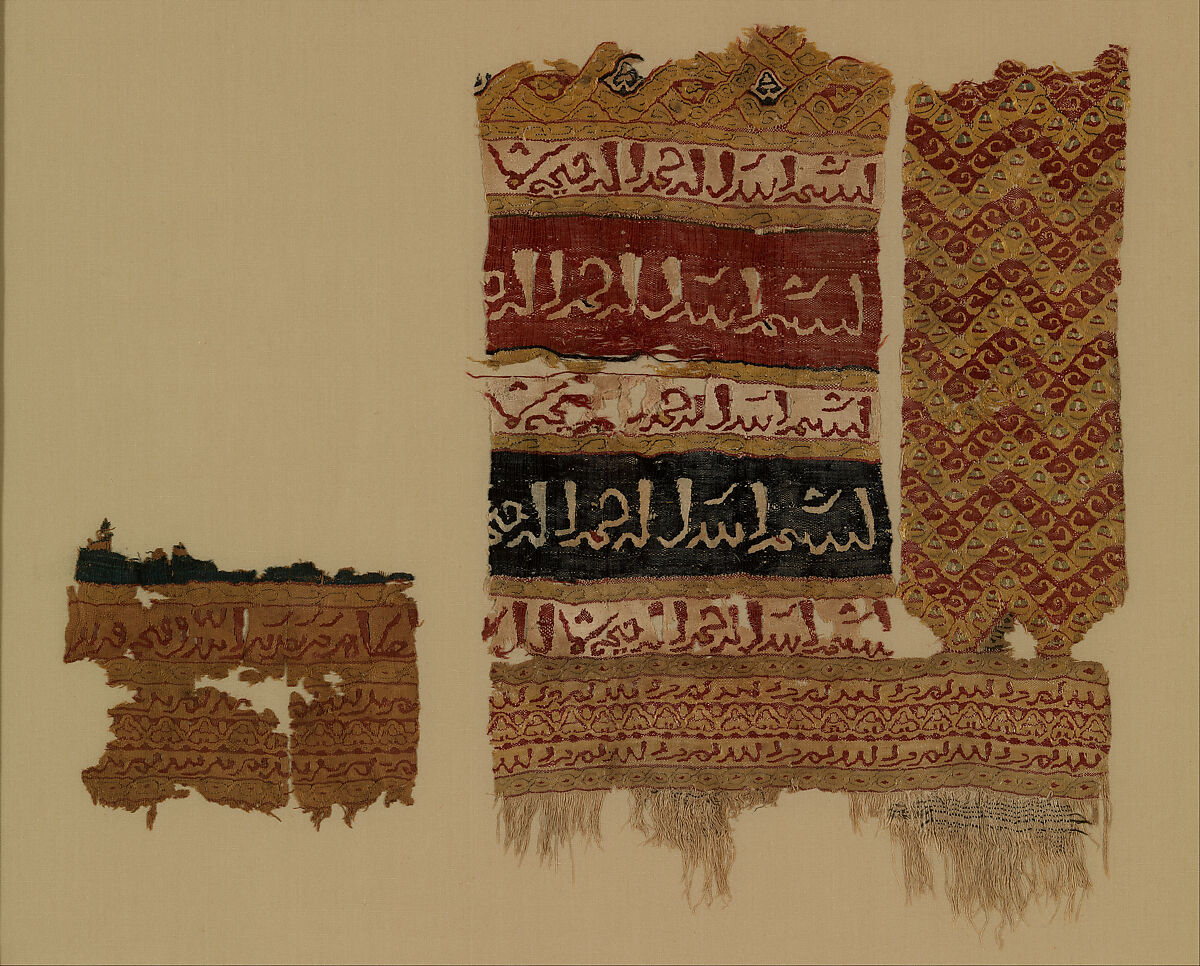 While it might be difficult to reconstruct the original appearance of this fragmentary tapestry-woven textile, the decorative style places it within the corpus of surviving textiles of the late Fatimid period, which is characterized by the use of golden yellow and red to create complex braided designs as seen on the top. Also representative of this late period is the shift towards the use of stylized inscriptions rendered in a cursive script. Although truncated, the Arabic inscription in the four bands on the right begins with, "In the name of God, the Merciful and Compassionate, There is no God but God;" while the two bottom lines contain a repetition of the phrase, "Victory is from God."