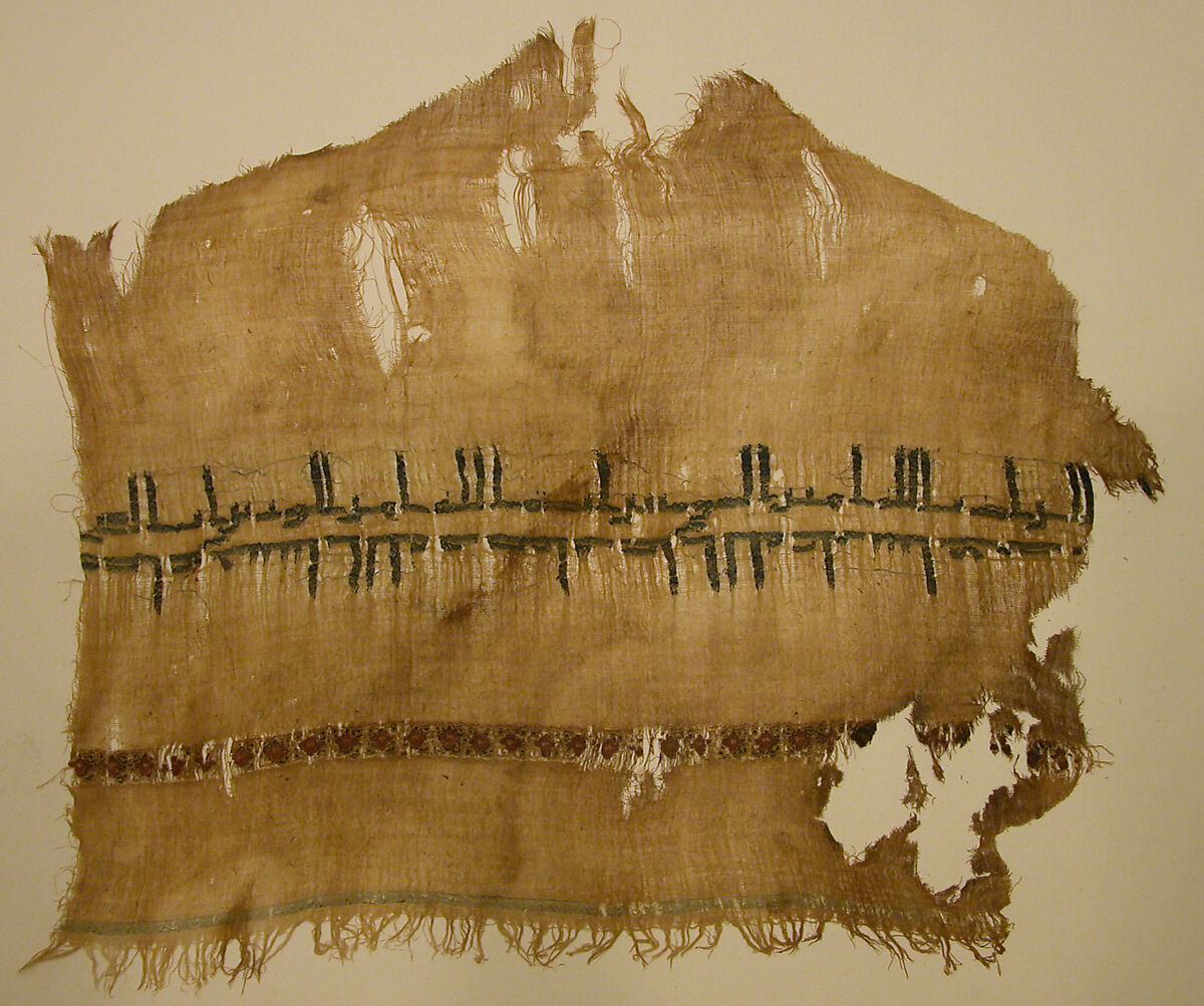 This textile fragment of uneven shape is decorated with tapestry-woven inscriptions and floral patterns on an undyed linen ground. An Arabic inscription in kufic script that includes the name of the caliph, Al-Radi (r. 934–40), runs across the piece at the center with a mirror image of the same inscription directly below it. This fragment is likely from the same textile as fragment 29.179.5a. They were either produced in private workshops or in workshops belonging to the caliph where fabrics were woven exclusively as gifts or for the royal household and members of the court.