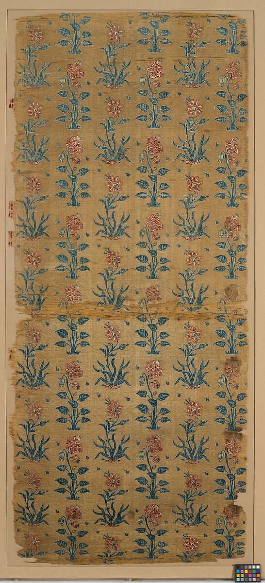 Textiles depicting formally arranged, naturalistic flowers on a neutral background were produced in great numbers during the reign of the emperor Shah Jahan (r. 1628–58). This distinctly Mughal decorative style developed from the influence of European herbal illustrations on traditional Indian depictions of nature. Despite their connection to medical illustrations these roses and lilies, while naturalistic, have been altered for aesthetic reasons and are not botanically correct.