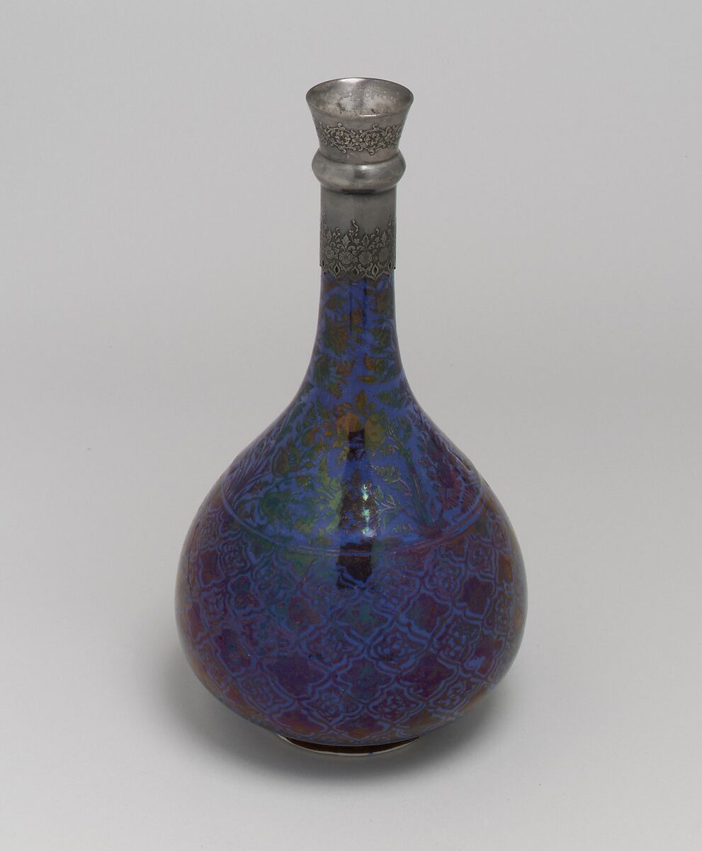 This pear-shaped bottle with a silver top is in many ways typical of the pieces created during the late seventeenth-century revival of the lusterware technique. These were often small objects decorated with floral and vegetal motifs on a deep blue ground. Unlike the Chinese wares also popular at this time, the shape and design of these lusterwares were based on Near Eastern prototypes, and not those from the Far East. Most common were bottles, ewers, jars, huqqa bases, bowls, and goblets. To create the luster effect, the white frit body of the ceramic was coated with a slip, possibly of pure ground quartz, here stained deep blue, other times a turquoise or lemon yellow. The vessel was then covered with a transparent glaze and painted with a coppery colored luster pigment that contrasted nicely with the matte glaze.
