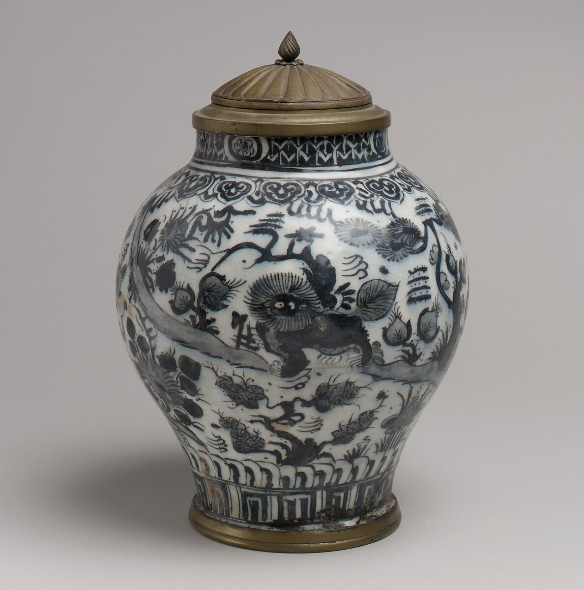 The centuries-long popularity of Chinese ceramics in the Islamic world continued into the Safavid era in Iran, as attested by pieces like this which were inspired by the shapes and conventions of painting particular to China. Of course, the most popular types were copies of blue-and-white ware. The staid depiction of a flowering landscape in a black and gray wash on a white background is interrupted by the humorous figure of a dandelion-headed lion. The foot rim, mouth rim, and cover of this jar were made of brass or silvered copper.