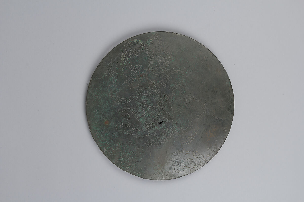 Zaō Gongen, the protector deity of the sacred Mount Kinpu in Nara (where this mirror was excavated), is considered the local Shinto manifestation of three Buddhist divinities as well as one of the most important deities of the Japanese religious mountain practice shugendō. Always depicted in a dynamic posture full of energy and vitality, the three-eyed Zaō here holds a vajra (thunderbolt) in his right hand and stands with his right foot raised.