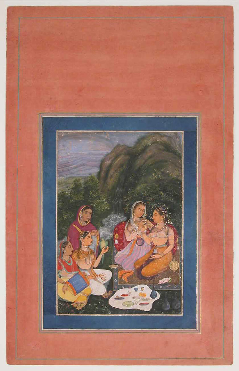 A princess is entertained by her companions with wine or sherbet, music and a green parrot. The delicately rendered figures are seated outdoors by a waterfall which emerges from a tall hillside of sweeping curves. Images of feminine gatherings first became popular subjects in Mughal albums of the second quarter of the seventeenth century. However, this painting is one of a group that were produced in the eighteenth century, seemingly inspired by the earlier Jahangiri style.