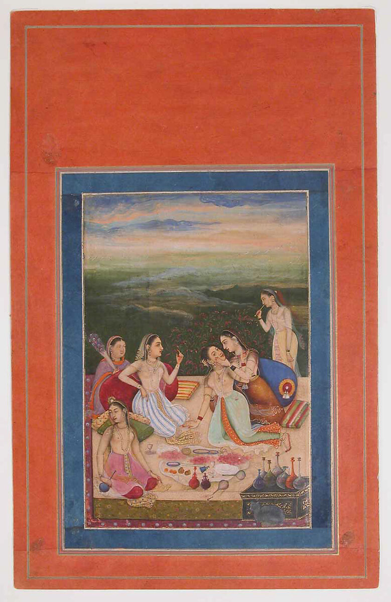 Frolicking noblewomen and their attendants are depicted on a terrace set against a receding background of green hills and distant mountain ridges with snow. The landscape and the distinctive pink blossoms suggest that the setting is the valley of Kashmir where Mughal nobility escaped for relaxation.