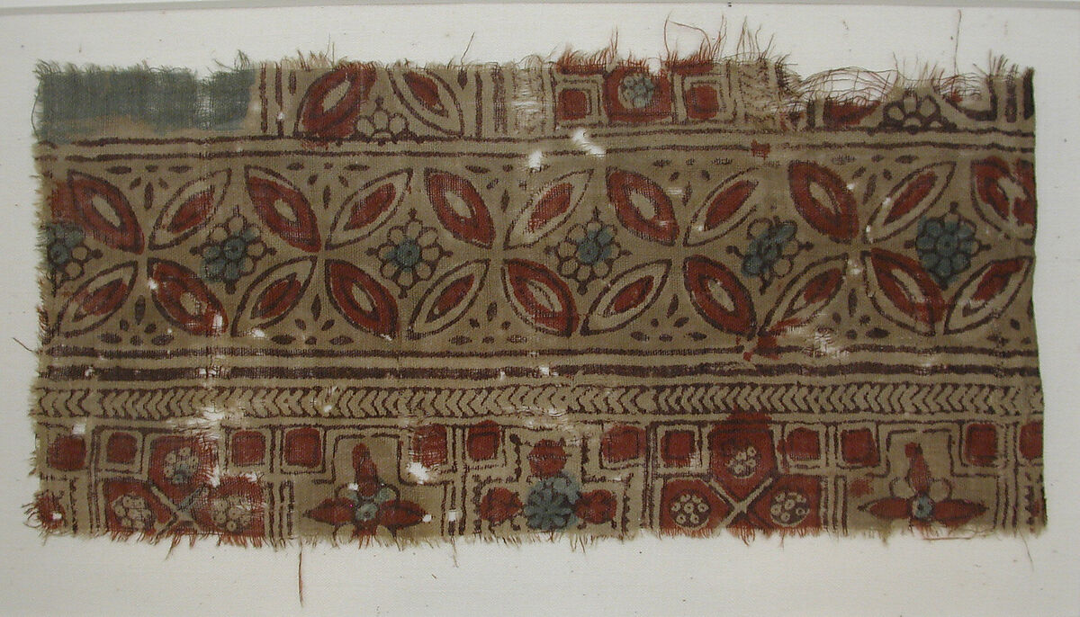 This object is one of a larger group of textile fragments made in Gujarat, India, but found in Fustat, Egypt (known as Old Cairo.) Dated to either the fifteenth or sixteenth century, it is decorated with patterns which echo the ornamental motifs found in painted Jain manuscripts made during this time. These features can be seen in the fragment’s repeated checkered patterning on the top and bottom borders, which are filled with crosses and divided into smaller squares with floral medallions.