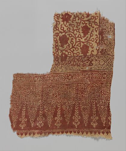The intricate tendril designs on this textile form elegant palmettes which enclose pearled borders and blooming heart-like buds in its interiors. This cotton textile which uses block-printing and mordant dye techniques points to the province of Gujarat as the place of production and a key center for the manufacture of textiles through the centuries. The ornamental features of this textile were meant to replicate luxury woven fabrics often found on the silks from Ikhanid Iran and Mamluk Egypt during the fourteenth century. Printed in Gujarat, this fragment not only represents Gujarat as a major exporter of printed and dyed textiles, but highlights the demand and taste for these textiles in Fustat, Egypt.