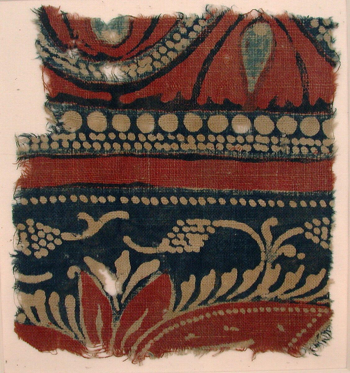 Produced in Gujarat, India, this fairly small cotton textile fragment would have once been part of a larger decorative textile found in Fustat, Egypt. Boldly decorated, this fragment’s stylistic motifs of ogival shapes and dots form a pattern of blooming floriated petals and tendril designs. Utilizing both mordant and resist dye techniques, this fragment is a vivid example of the extensive use and popularity of indigo dyes in Gujarati textile design during the sixteenth and seventeenth centuries. This fragment highlights the demand for the vibrantly dyed and decorated Gujarati textiles, their circulation through Indian Ocean trade networks, and their appeal within the context of Egypt.