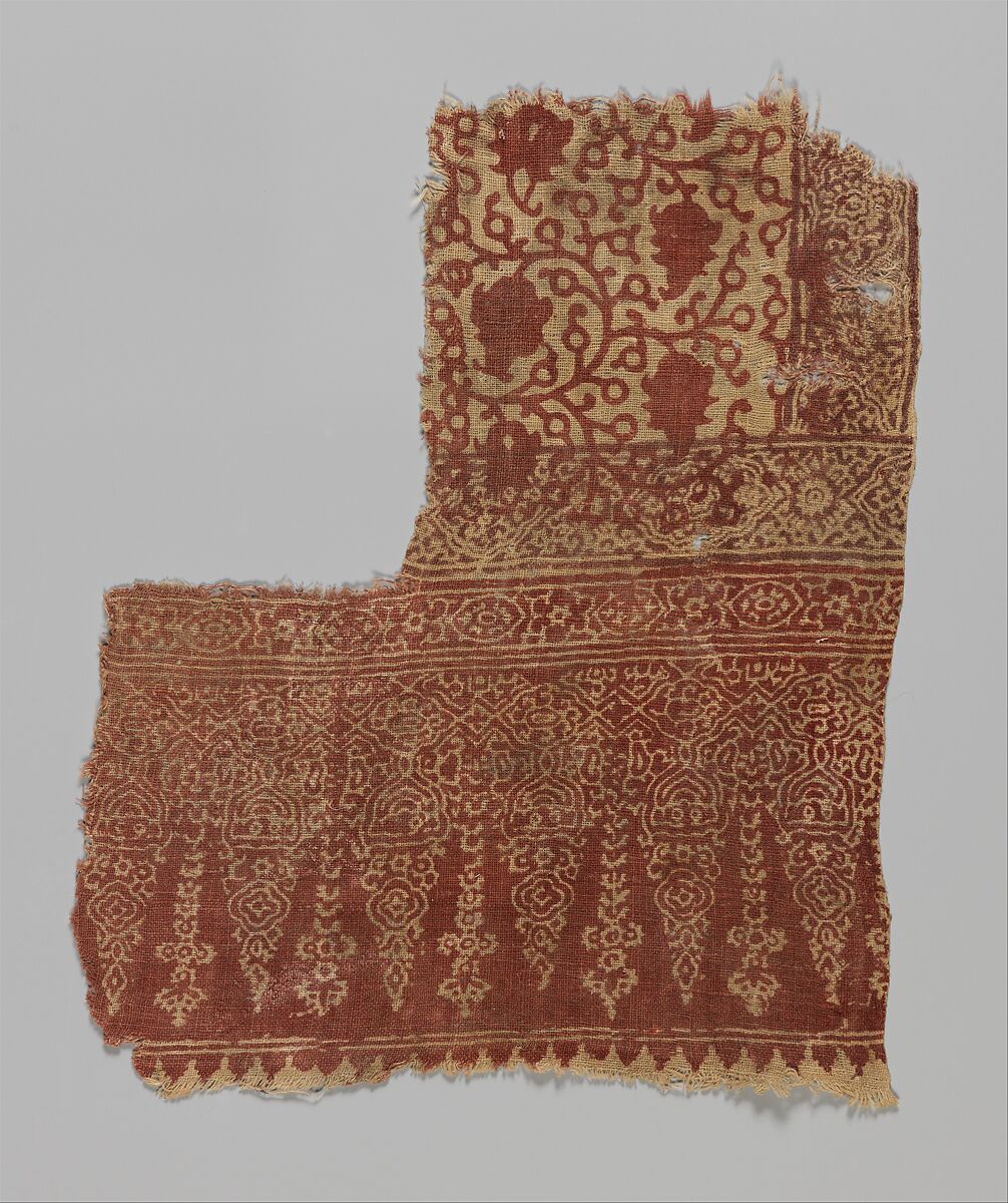 This textile, which is one of a larger group of textile fragments found in Fustat, Egypt (known as old Cairo), but produced in Gujarat, India serves as evidence of the maritime trade relations between the two areas. This relationship can be traced as far back as the tenth century and extends into the nineteenth century. Fustat’s dry and arid climate allowed for the preservation of these textiles unlike the monsoon heavy climate in India which would have caused the deterioration of the design and fabric. Not only does this textile reveal the transregional connectivity of the Indian Ocean, but shows how the use of these brilliant and vibrant mordant dyes and block-printing techniques became hallmarks of Gujarati textile production and led to their demand and popularity across the globe.