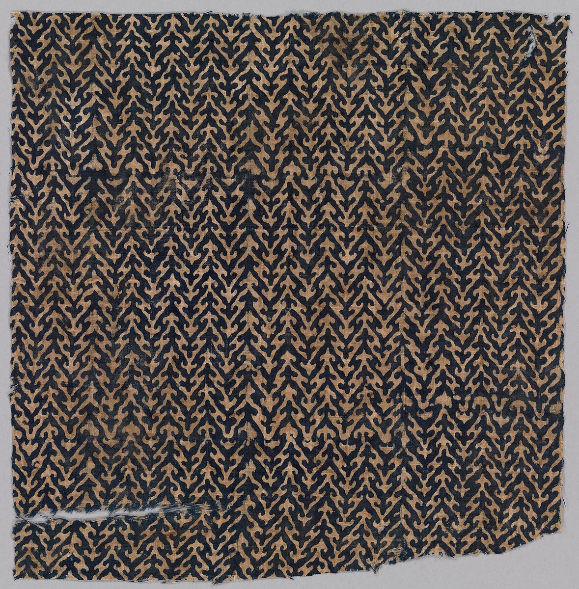 Dated to either the thirteenth or fourteenth century, this plain-woven, block-printed, cotton textile fragment was once part of a much larger piece. This fragment exhibits the unique characteristics of technique and decoration associated with textile production in Western India, in the province of Gujarat, during the Middle Ages. The fragment’s design creates an interlinking chevron pattern which was a design specifically produced for an Egyptian market. Many fragments with this design have been found in Egypt, a fact indicating that such block-printed vibrant fabrics with this design were highly in demand.