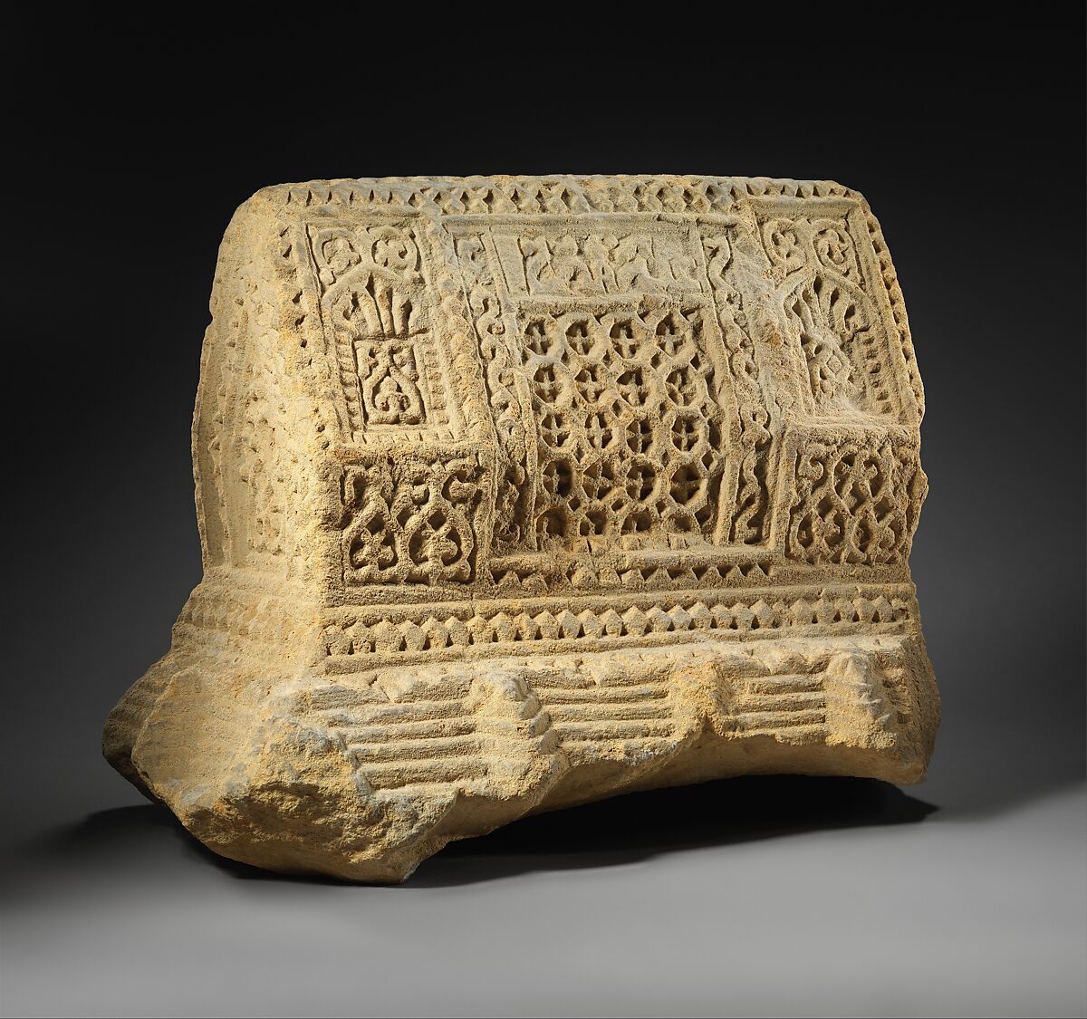 This sarcophagus-shaped stone would have been attached to the lid of a grave marker. Each of the long sides has three sections. On either side of the central section, arches enclose a scallop surmounting a trefoil vine. Scallops have funerary associations going back to the Romans that continued into Islamic times. The dense geometric decoration recalls filigree, which would have been familiar where this stone was found, in Hamadan, a jewelry-making center.