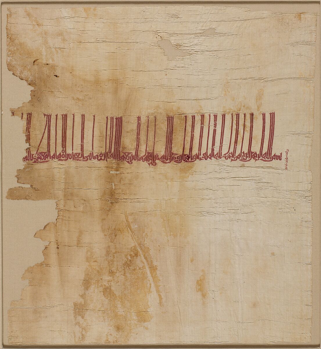 Like many tiraz textiles, the kufic inscription embroidered across the central field of this fragment includes the name of the Abbasid caliph, al-Mu'tadid (r. 892–902), and phrases in praise of him and the Prophet Muhammad. A tiny inscription in the right margin contains the name Ibn Khushu'i, possibly the embroiderer. The silk and cotton woven fabric is referred to in the Arabic literature as mulham, which has been associated with Merv—the Abbasid capital of Khurasan in eastern Iran, now in Turkmenistan.