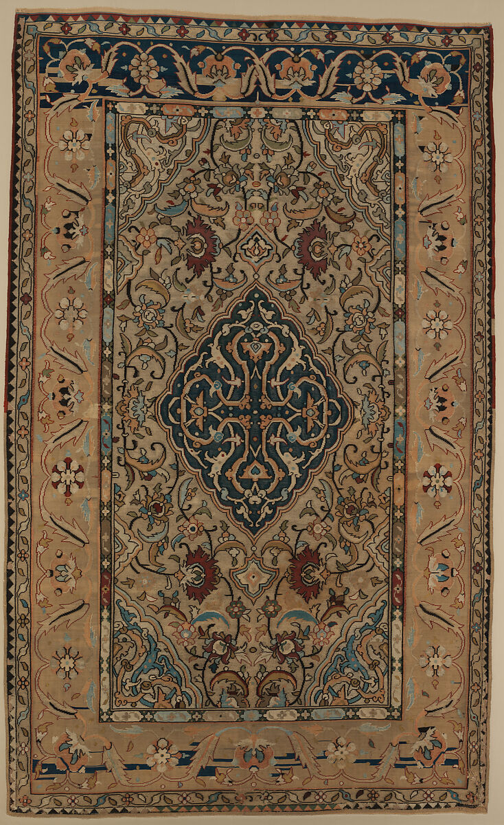 This carpet was among those produced for export to Europe and was formerly in the collection of the Royal House of Saxony. Unlike examples with scenes of animal combat or floral patterns within the central medallions, the field of this carpet contains a cross, an apt symbol for a European patron. The leaves with serrated edges, lotus flowers, and overlapping vine scrolls in the corners are typical decorative features of this class of carpet.