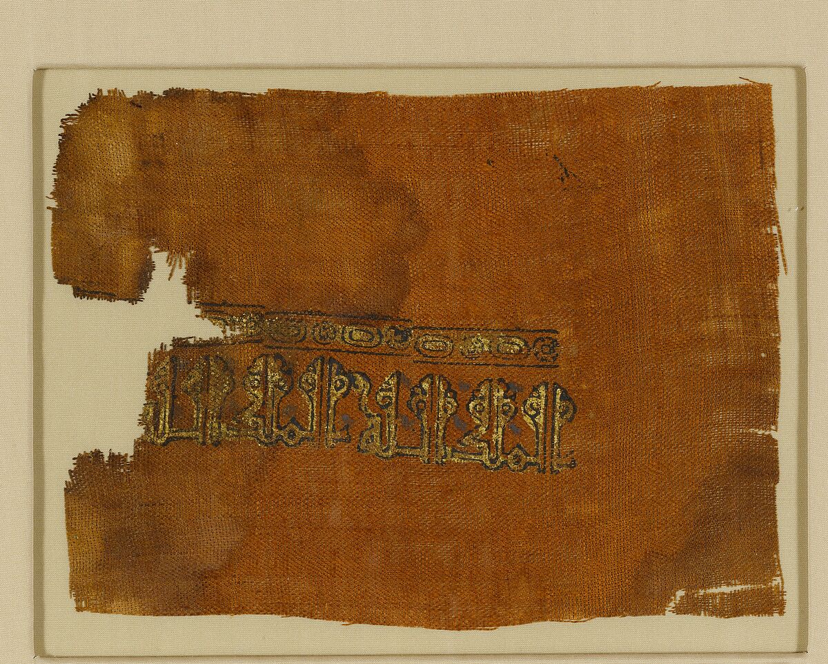 This dyed linen fragment is hand-blocked with a repeating inscription in kufic, “Sovereignty is Allah’s” in black outline and gilded. Above the inscription is a simple horizontal border of alternating circles and ovals within straight lines. The print is ornamented further through the stylization of the vertical shafts of the letters and the purposeful mirror images that are created within the inscription, giving the design a rhythmic cadence. The uneven printing of the inscription and the quotidian nature of the phrase suggest the textile may have been mass produced.