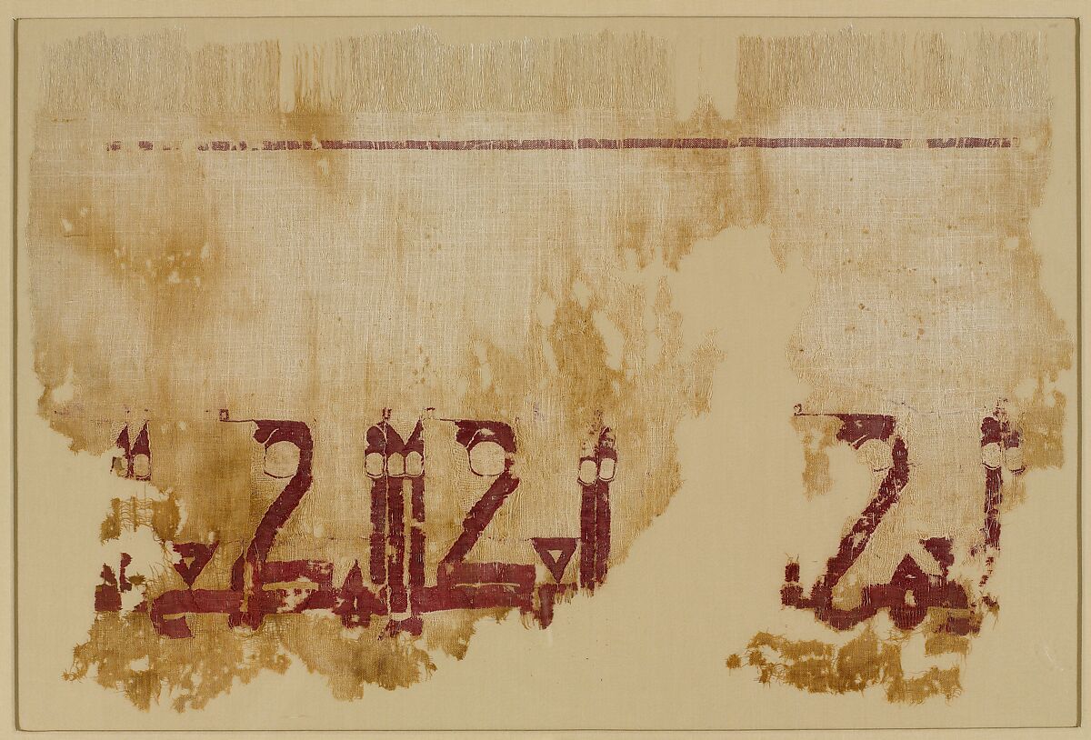 Egypt was home to a number of state‑run textile factories sponsored by the Abbasid caliphs in Baghdad until about 969. These factories produced a cloth known as tiraz—a term that came to refer both to garments with inscriptions and to the workshops that manufactured them. This textile was woven for the Abbasid caliph al‑Muti', whose rule in Baghdad (946–74) coincided with the Buyid conquest of the city. The monumental scale of the calligraphy and its location near the edge of this fragment indicate that it originally belonged to a large textile, perhaps a shawl.