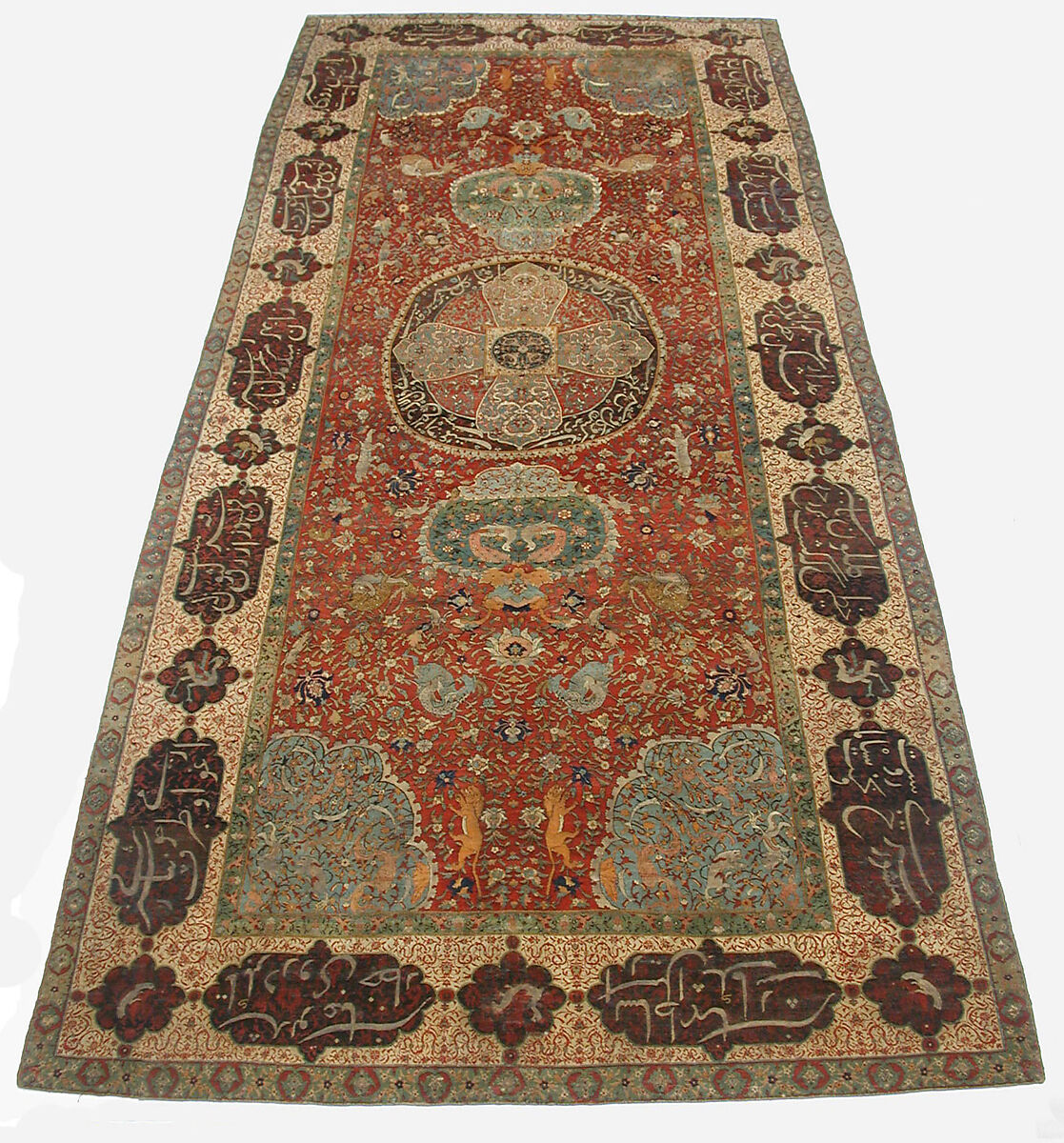 - Medium: Silk (warp and weft), wool (pile), metal wrapped thread; asymmetrical knotted pile, brocaded