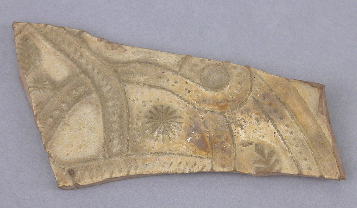 Finds like this fragment, which was excavated at a site called West Mound, where the bath of Palace Taq-i Kisra was believed to be located, attest instead to the continued occupation of Ctesiphon’s urban area in the early Islamic period. The fragment belongs to a group of dishes and other vessels made in Iraq in the ninth century. They all feature a molded decoration of interlace designs, which appear to be an evolution of Late Antique ones. The addition of green splashes unrelated to the molded design represents the expression of the aesthetic of the time.